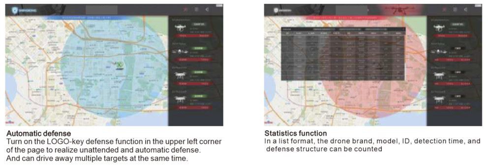 İhA'ları izinsiz kullanmak için şunları seçebilirsiniz: Tek tuşlu otomatik savunma: Sistem savunma işlevi etkinleştirildikten sonra, izinsiz giriş dronu, görevli personel olmadan sistem tarafından otomatik olarak savunulacaktır; Manuel müdahale: Herhangi bir drone'u ve zaman savunmasını nasıl savunmayı veya savunmayı kesmeyi manuel olarak seçebilir ve pilotu bulmayı seçebilirsiniz.